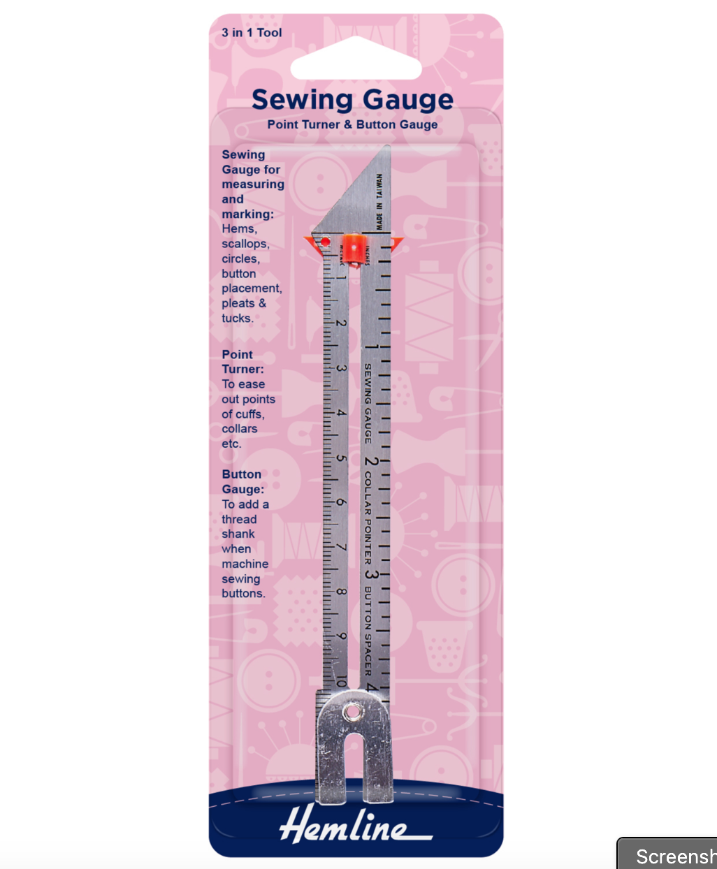 Ideal for sewing and knitting projects. Use to accurately measure hems, pleats, buttonholes, etc. Incorporates a point turner to ease out collars or cuffs, and a button gauge to measure shank depth before sewing on.