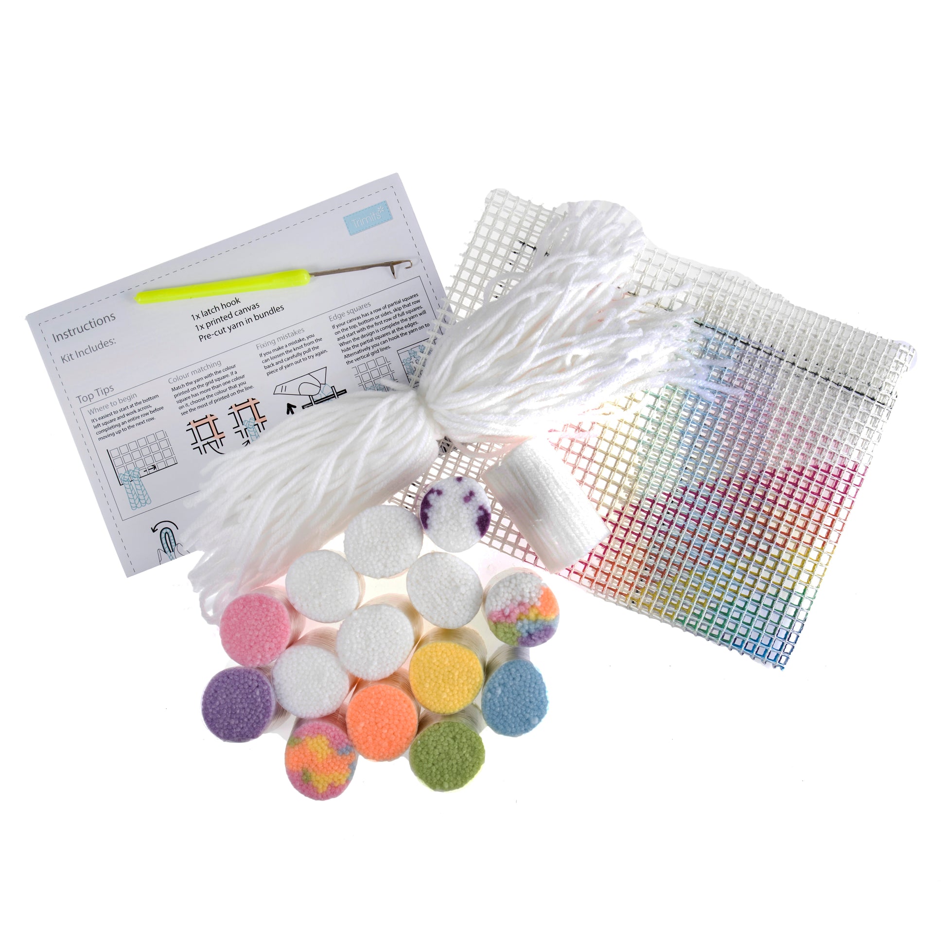 - Each kit contains everything you'll need to get started including: printed latch hook canvas; latch hook tool; acrylic yarns and instructions in three languages (EN, FR, GER).