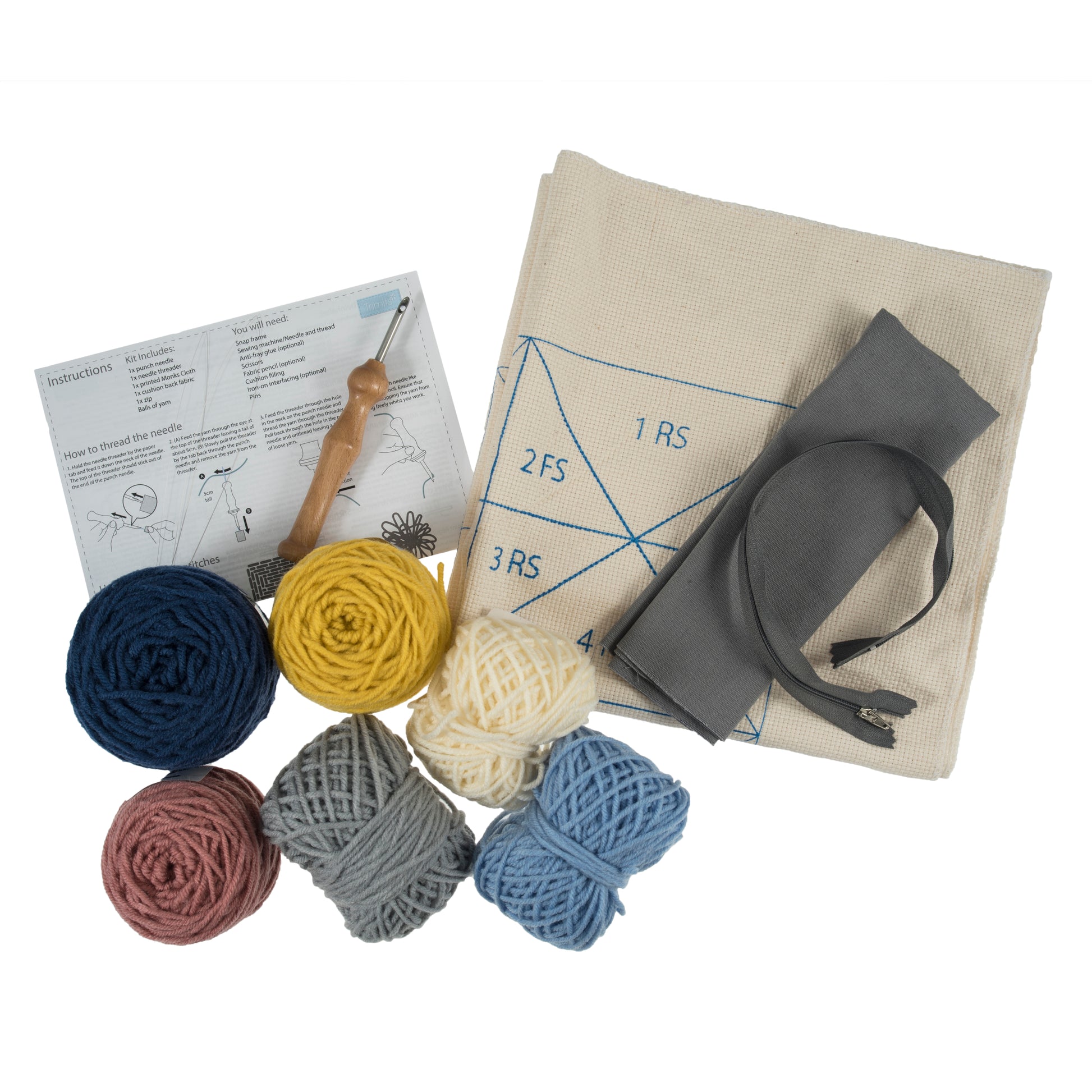 - Kit includes: punch needle fabric, punch needle tool, needle threader, yarns, cotton cushion back with zip.